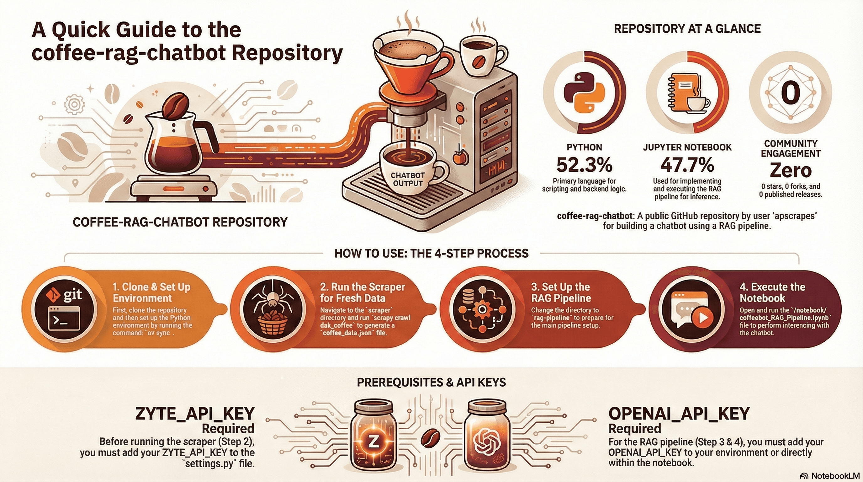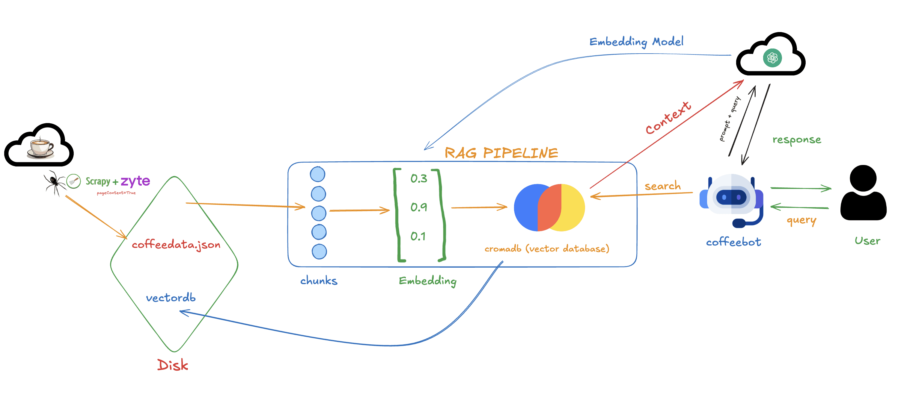 The RAG pipeline (coffeebot_RAG_Pipeline.ipynb) follows a straightforward flow: