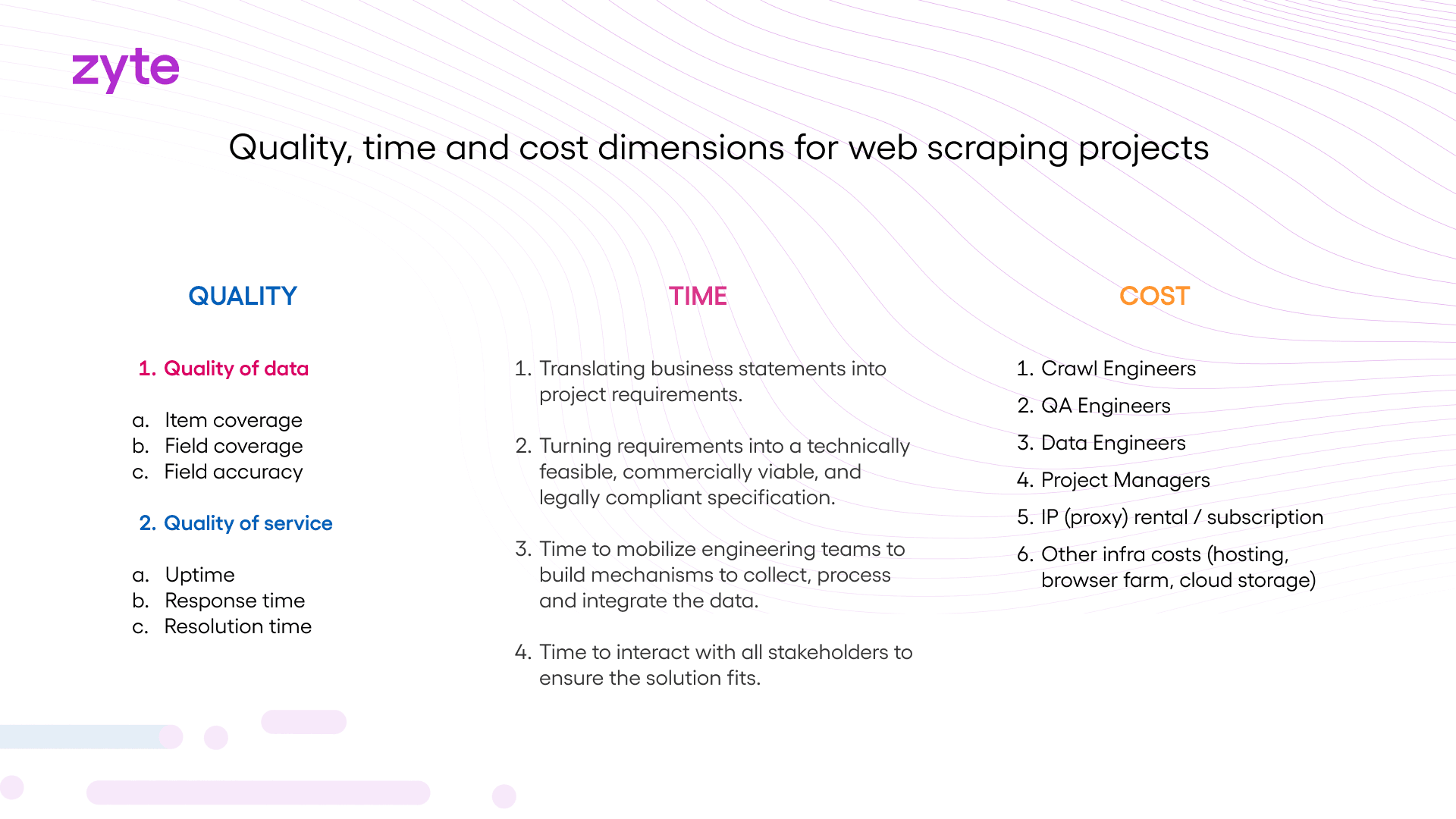 Zyte has been sourcing data for some of the world’s biggest companies for over 14 years. Our refined processes and proprietary technology have been optimized for efficiency and cost-effectiveness, culminating in a simple three-step decision-making framework for accessing web data:
