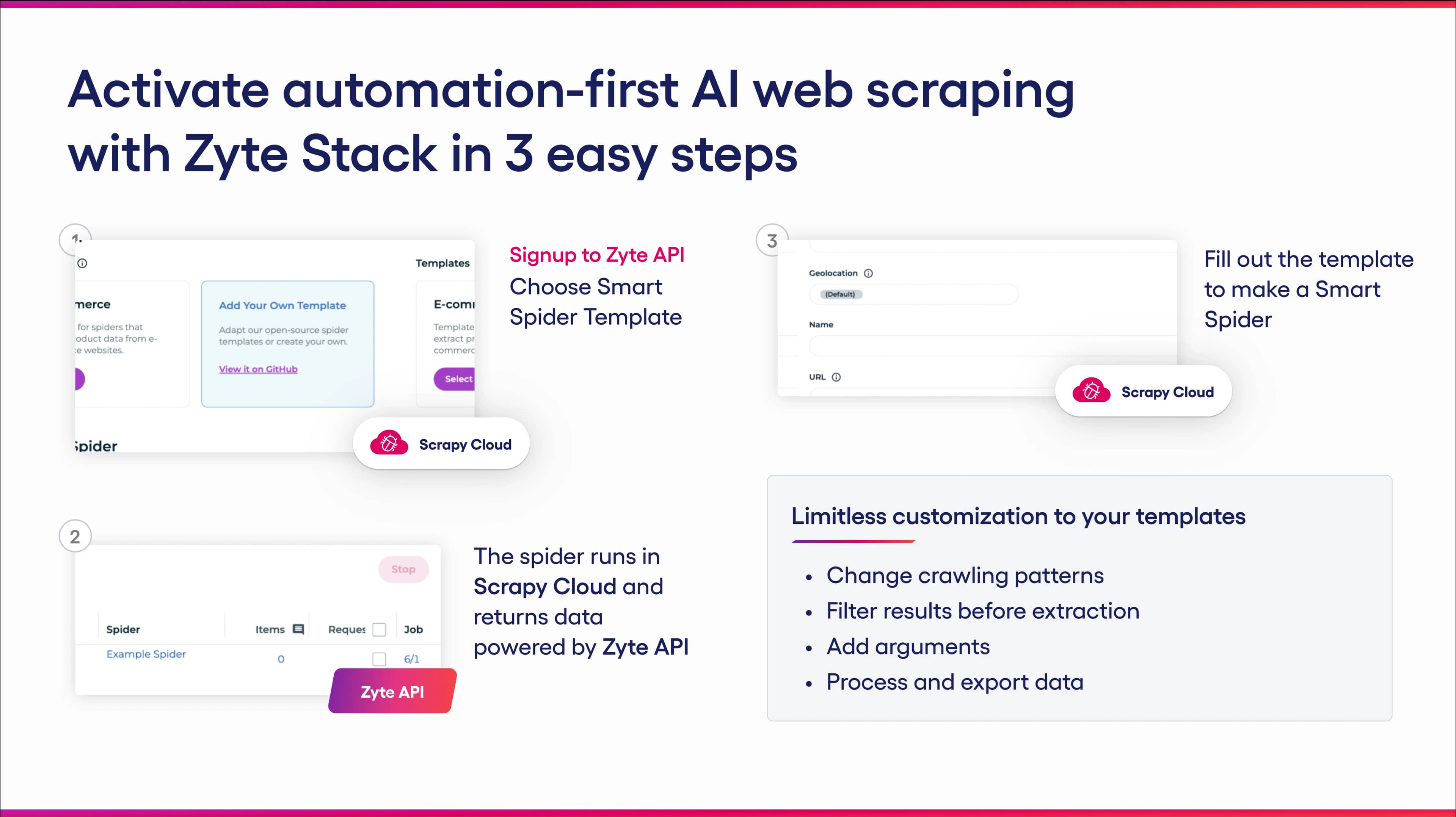 Zyte API is built upon Scrapy, the world’s most popular scraping framework. We’ve created spider templates that harness Zyte API’s AI features to unblock and automate from end to end. Simply run the templates as is for instant data, as our AI is trained to recognize all common and uncommon navigation patterns.