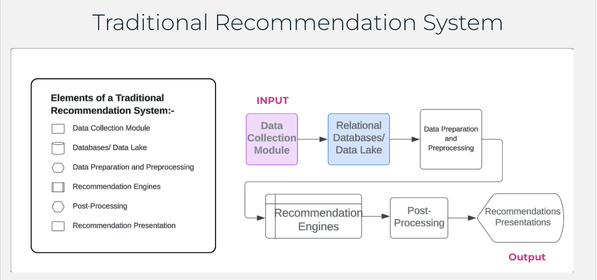 Building the System Keeping Context/Use-Case in Mind (Tailoring the Recommendations): When designing a process or a system, the ultimate goal should guide every step. For example, if you plan to bake a cake, you choose the type of cake, select the recipe, gather the ingredients, store them appropriately, prepare the mixture, bake it, and finally, taste-test the cake to garner feedback for future baking endeavours. This concept also applies to a recommendation engine in technology, which should be designed keeping the specific use case and the individual user's preferences in mind. Here, tailoring recommendations becomes vital. The engine should not merely suggest random options; instead, it should customize its suggestions based on user behaviour, tastes, and context. This tailored approach enhances the relevance of the recommendations, creating a more satisfying and engaging user experience, thus optimizing the effectiveness of the overall system.