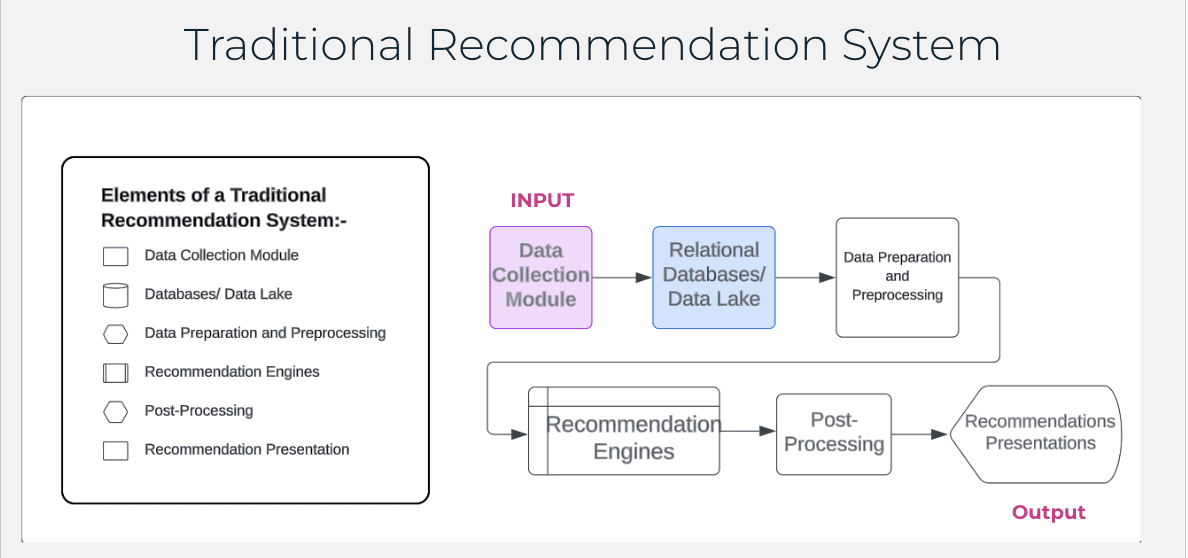 Building the System Keeping Context/Use-Case in Mind (Tailoring the Recommendations): When designing a process or a system, the ultimate goal should guide every step. For example, if you plan to bake a cake, you choose the type of cake, select the recipe, gather the ingredients, store them appropriately, prepare the mixture, bake it, and finally, taste-test the cake to garner feedback for future baking endeavours. This concept also applies to a recommendation engine in technology, which should be designed keeping the specific use case and the individual user's preferences in mind. Here, tailoring recommendations becomes vital. The engine should not merely suggest random options; instead, it should customize its suggestions based on user behaviour, tastes, and context. This tailored approach enhances the relevance of the recommendations, creating a more satisfying and engaging user experience, thus optimizing the effectiveness of the overall system.