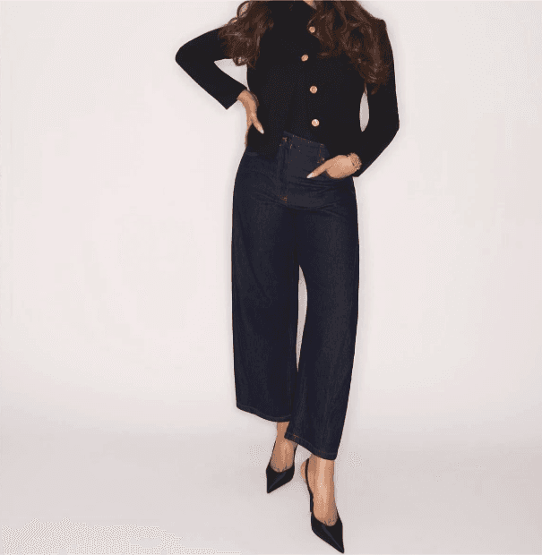 It's a full outfit: a black asymmetric jacket with gold buttons, dark indigo wide-leg cropped jeans, and black pointed-toe heels. Three distinct pieces.