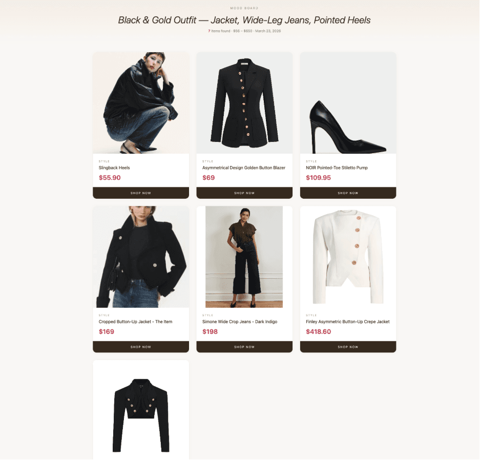 One query isn't enough. "Black asymmetric gold button jacket" returned a mix of product pages and category pages. A second, slightly different query ("black cropped jacket gold buttons women shop") filled the gaps. The skill now runs two query variations per item and merges results. Broad queries return editorial roundups. Tight, varied queries return things you can actually buy.