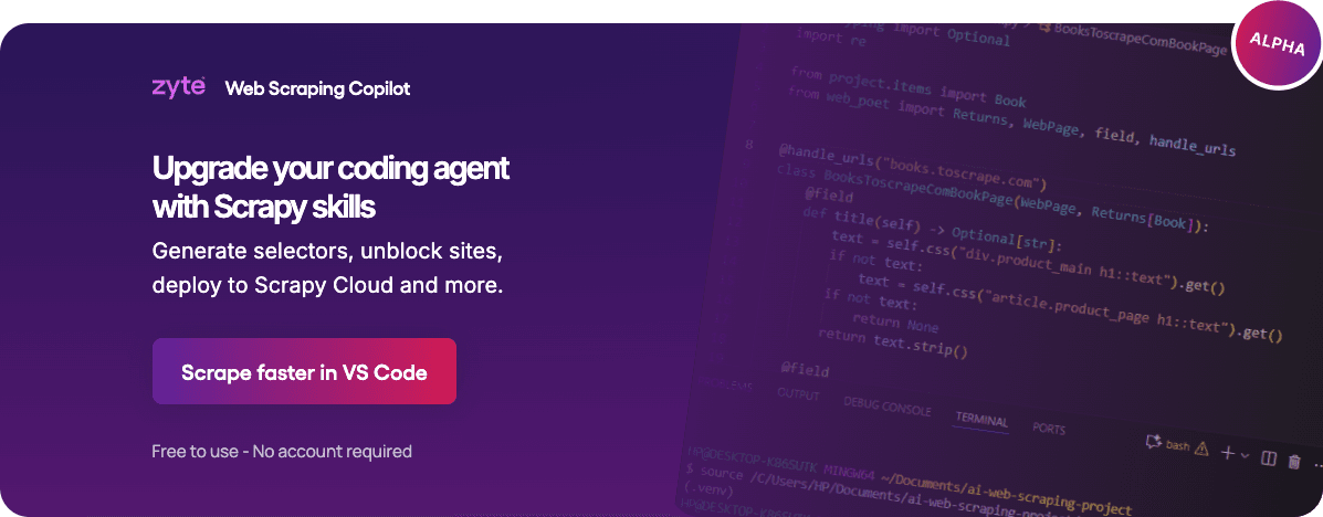 The Web Scraping Copilot doesn't replace you. It accelerates you. It automates the 90% of work that is "grunt work" (finding selectors, writing boilerplate, creating tests) so you can focus on the 10% of work that matters: crawling logic, strategy, and handling complex sites.