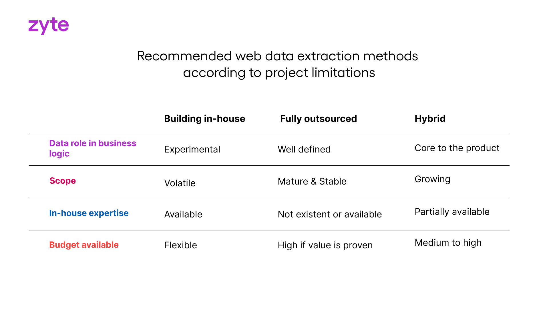 When deciding between in-house, outsourced or hybrid web scraping operations, you need to ask if web data extraction is at the core of your business. The general consensus is that you should build in-house operations if web scraping is a core part of your business. However, it can be more nuanced than that, so let’s take a look at the three options.