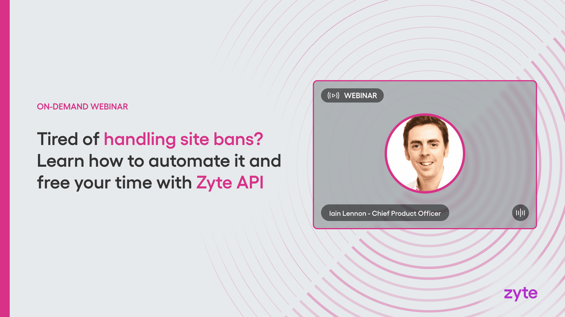 In this webinar, presented by Iain Lennon, our CPO, and Daniel Cave, our Head of Product Marketing, we're diving into Zyte API capabilities for handling bans and how this can be a game-changer for web scrapers trying to run an uninterrupted operation that scales.
