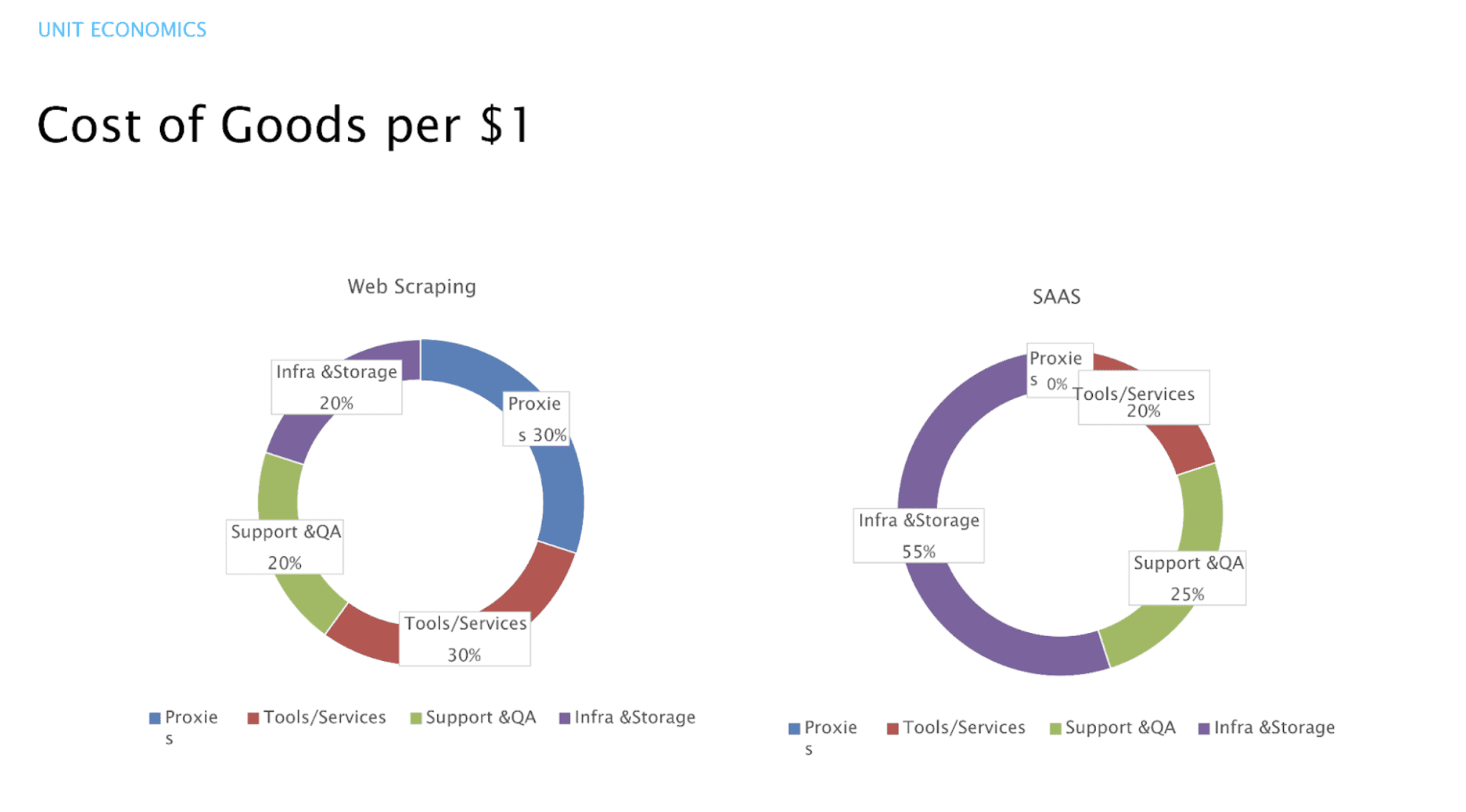 A web scraping business, however, looks very different. Proxies can easily consume 30% of your COGS. Tools and specialized services can take another 30%.