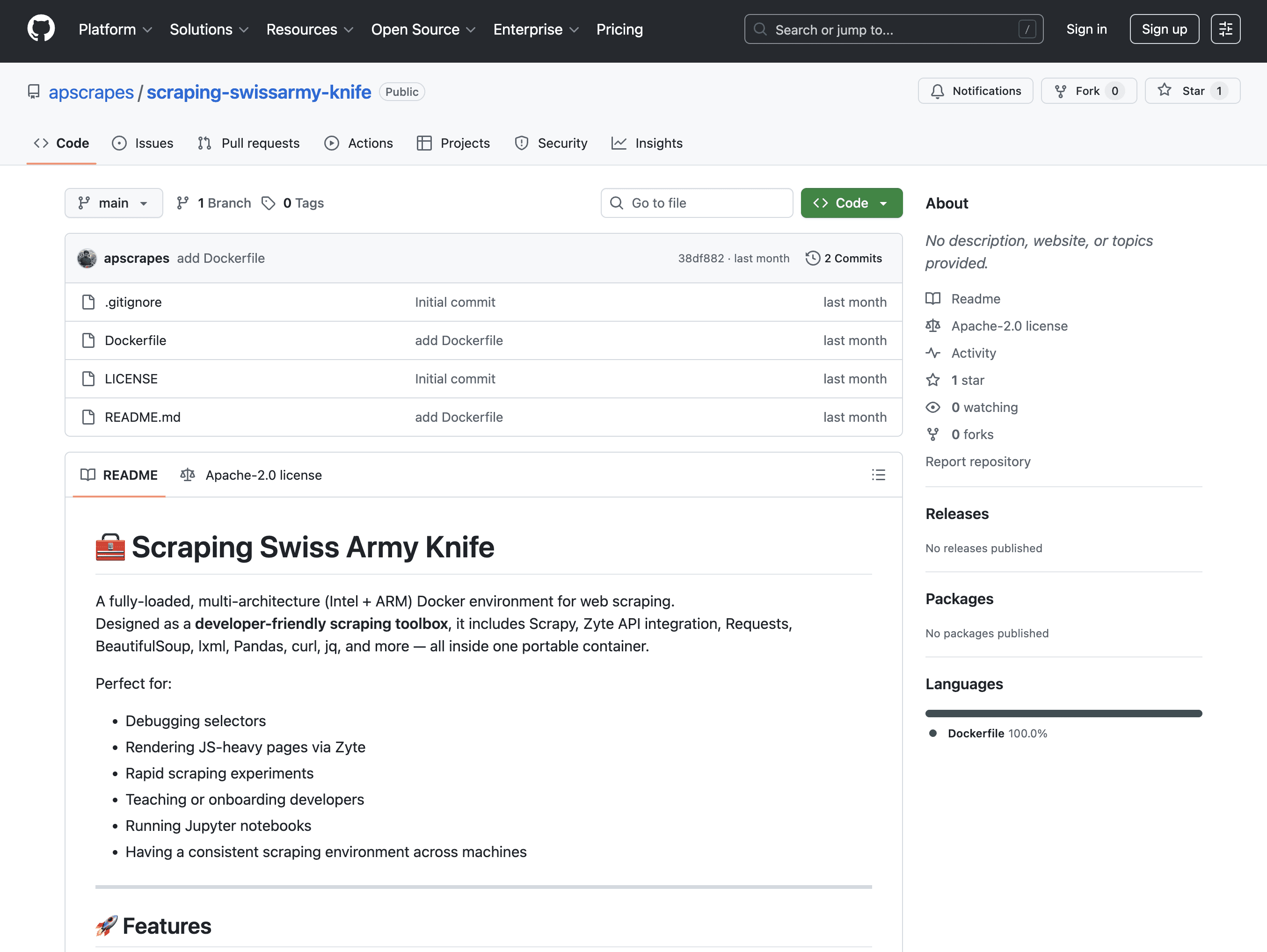 What I really wanted was a ready-made scraping environment with all common tools already installed, something that works on any machine (Intel or ARM) and something I can start, experiment with, throw away and recreate anytime