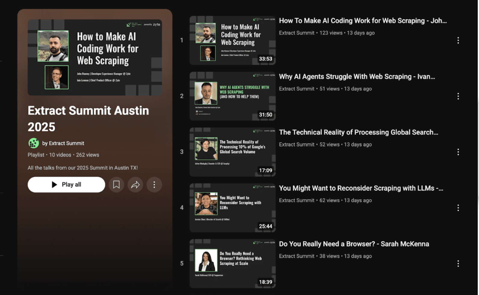 Extract Summit Austin in September was a blast. Watch deep-dives from the summit into Zyte’s latest features, practical demos, and industry insights from data leaders shaping the future of web data. Catch up anytime and see what’s next for the ecosystem.