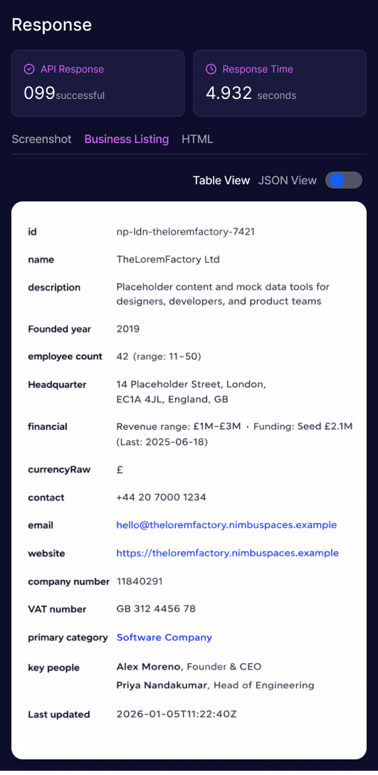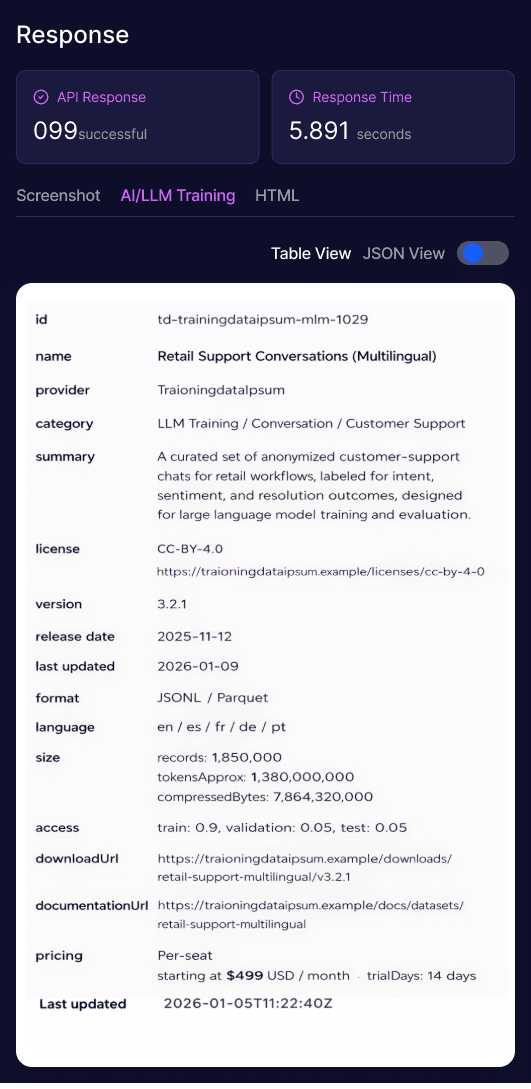 Clean, structured delivery. Data arrives ready to use in your preferred schema and format.